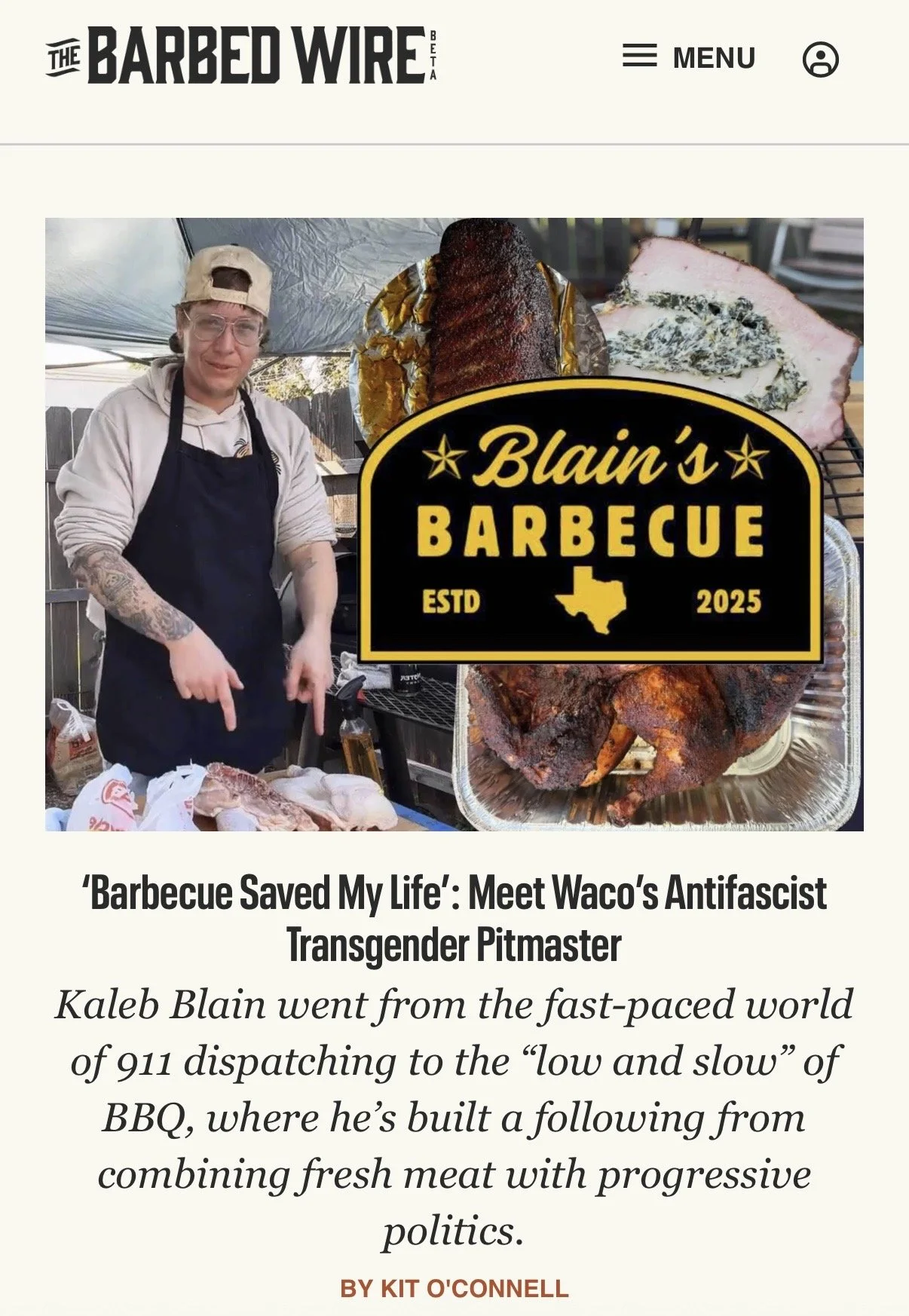 Hey y’all! I’m Kaleb owner/pitmaster at Blain’s BBQ, located in Waco, Tx. Blain’s is a queer-led, community focused concept. My mission is to provide high quality Texas BBQ that is accessible to everyone, regardless of identity or income. I’ve spent some time behind the smoke, and if there’s one thing I’ve learned, it’s that the best BBQ isn’t about the most expensive cut of meat—it’s about the time, the skill, and the person you’re sharing it with. I started Blain’s BBQ with a simple goal, to use my craft as a pitmaster to serve my neighbors. By focusing on cheaper cuts like pork and chicken, I’m able to keep prices fair without ever cutting corners, every meal is a labor of love designed to feed your family without breaking your budget.
